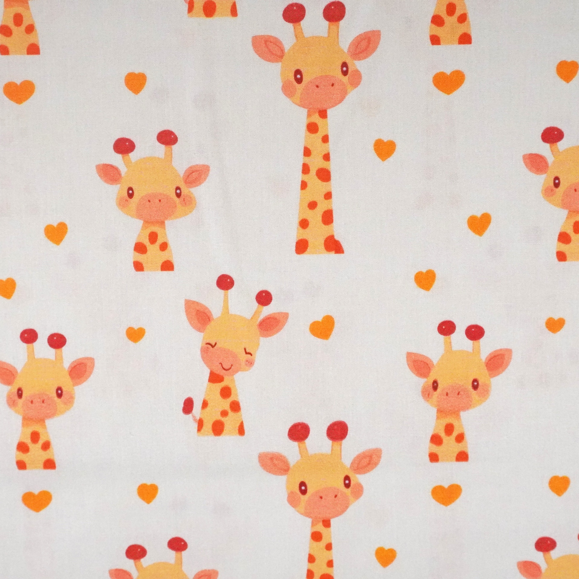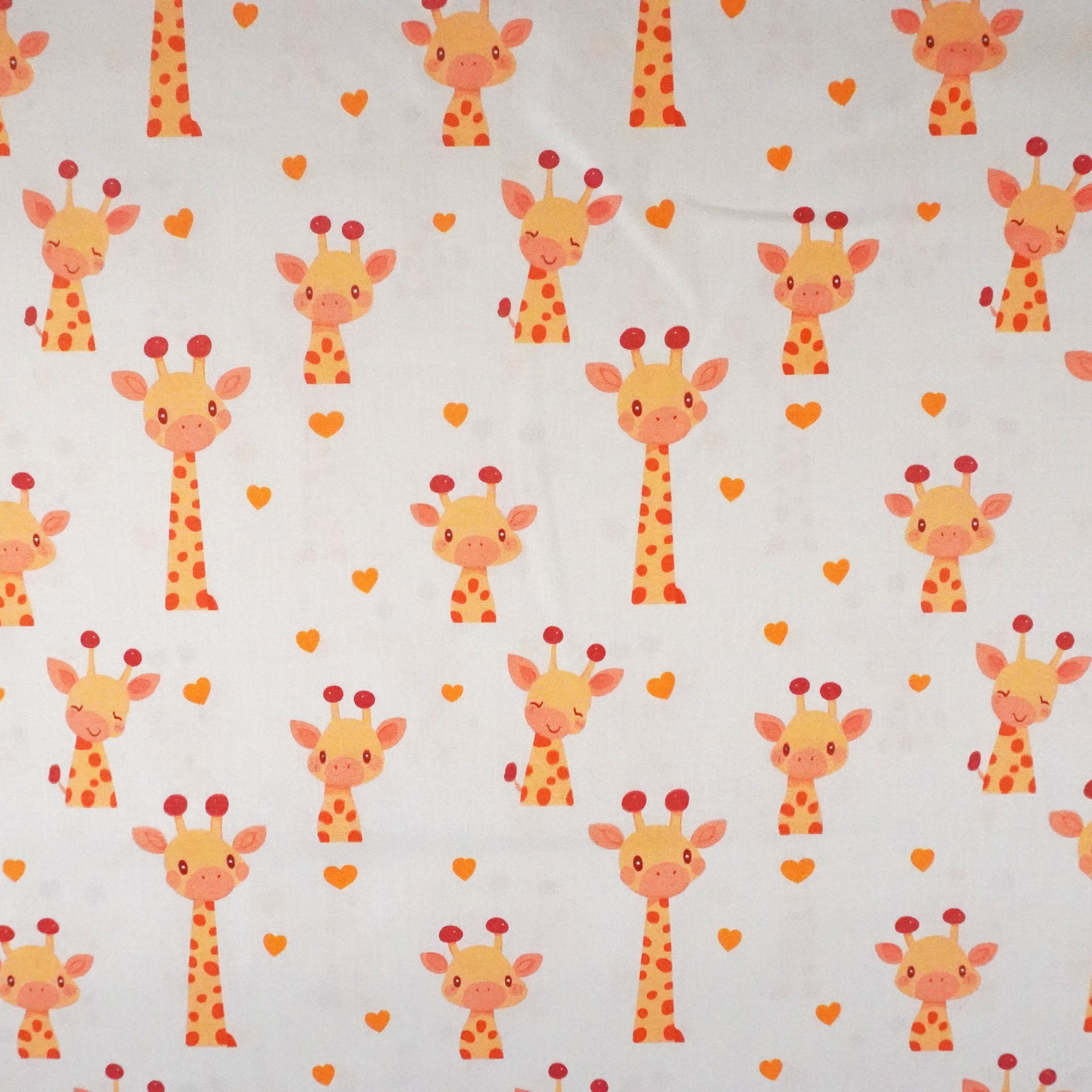 Tecido infantil branco com girafas e corações laranja. Algodão suave e resistente, ideal para patchwork, roupas de bebé, artesanato e decoração infantil.