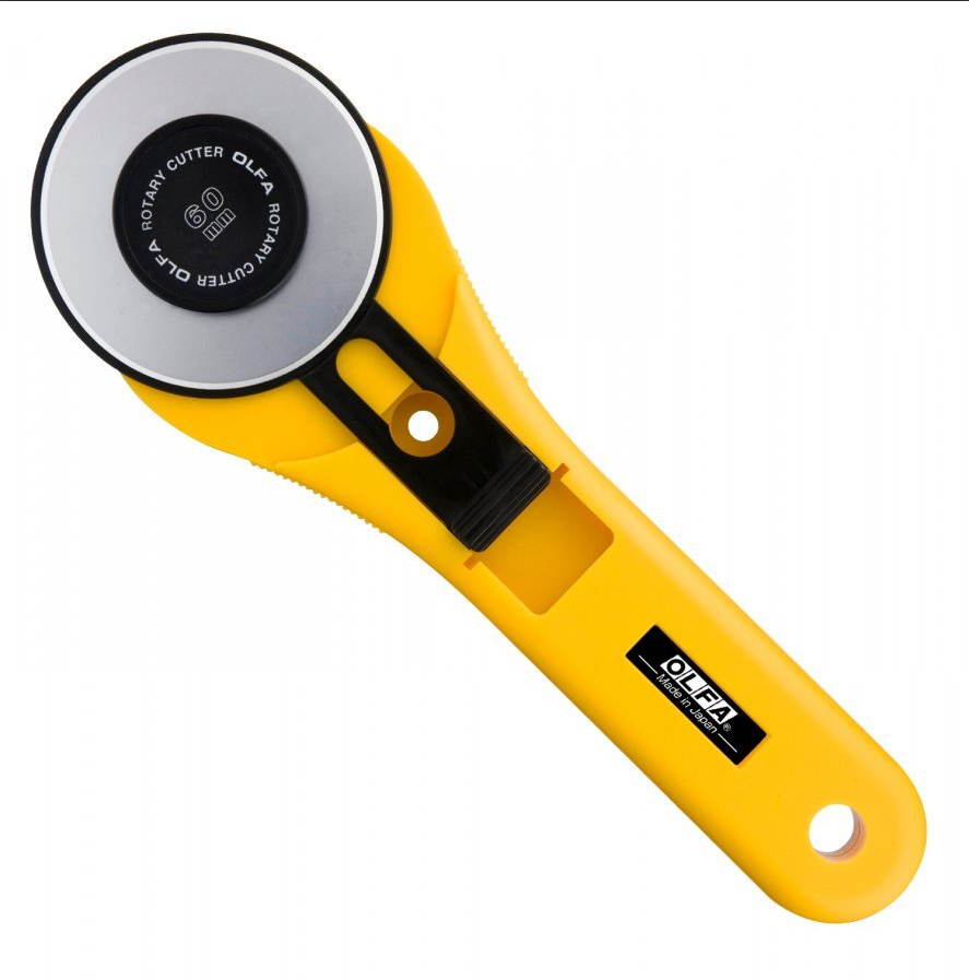 Cortador Rotativo 60mm O cortador rotativo de 60mm é ideal para cortar até 6 camadas de tecido de uma só vez. Prático e preciso, permite fazer cortes limpos em tecidos pesados, papel, lona, vinil, estofos e muito mais.