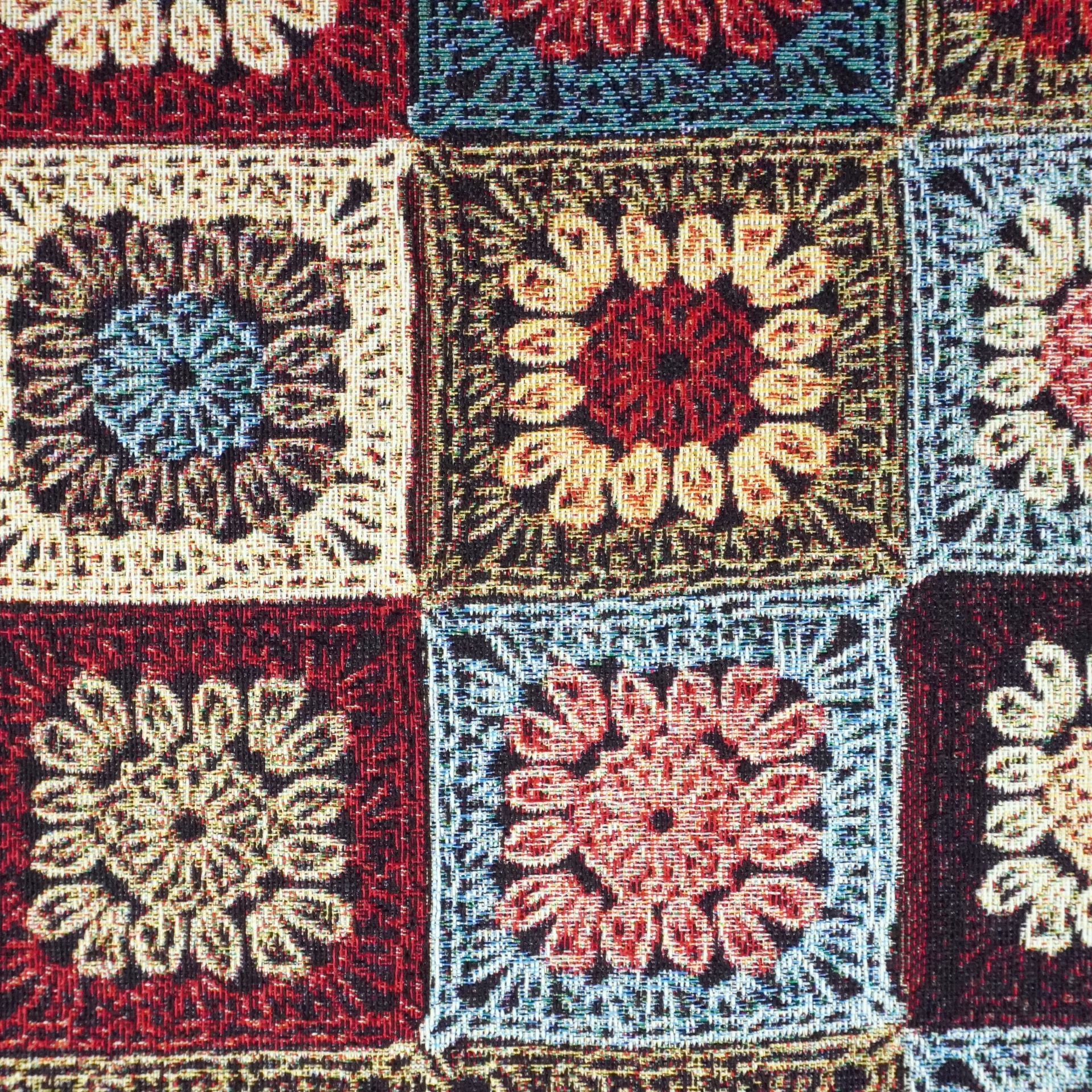 Tecido gobelin encorpado com estampa inspirada nos quadradinhos de croché. Apresenta flores coloridas em tons vintage, ideal para almofadas, estofos, malas e costura criativa