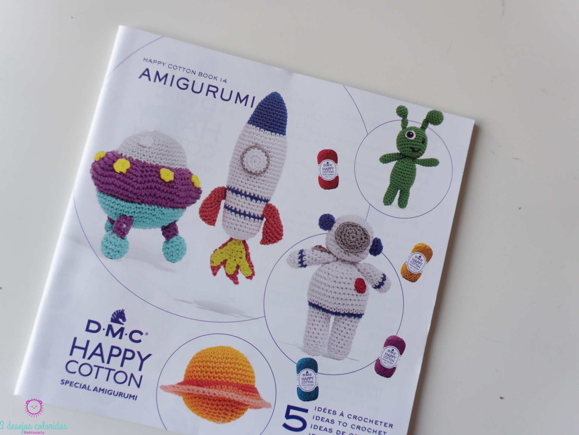 Livro com as receitas dos amigurumis que estão na capa, tem instruções em esquema e por escrito.