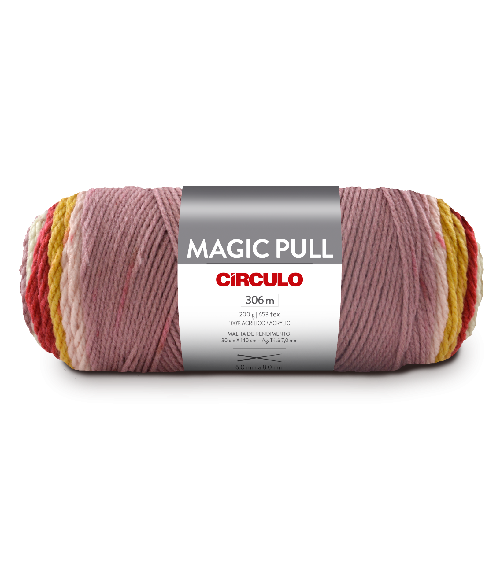 Este fio é projetado para que o fio seja retirado do centro, facilitando a confecção das peças. A pontinha do fio está sinalizada com o selo do sistema “Easy Pull” – Puxe Fácil, patenteado pela Círculo. Magic Pull tem cores contrastantes que se unem em forma de listras com pequenos pontos de cor que decoram e criam efeitos alternados ao tecer a peça.