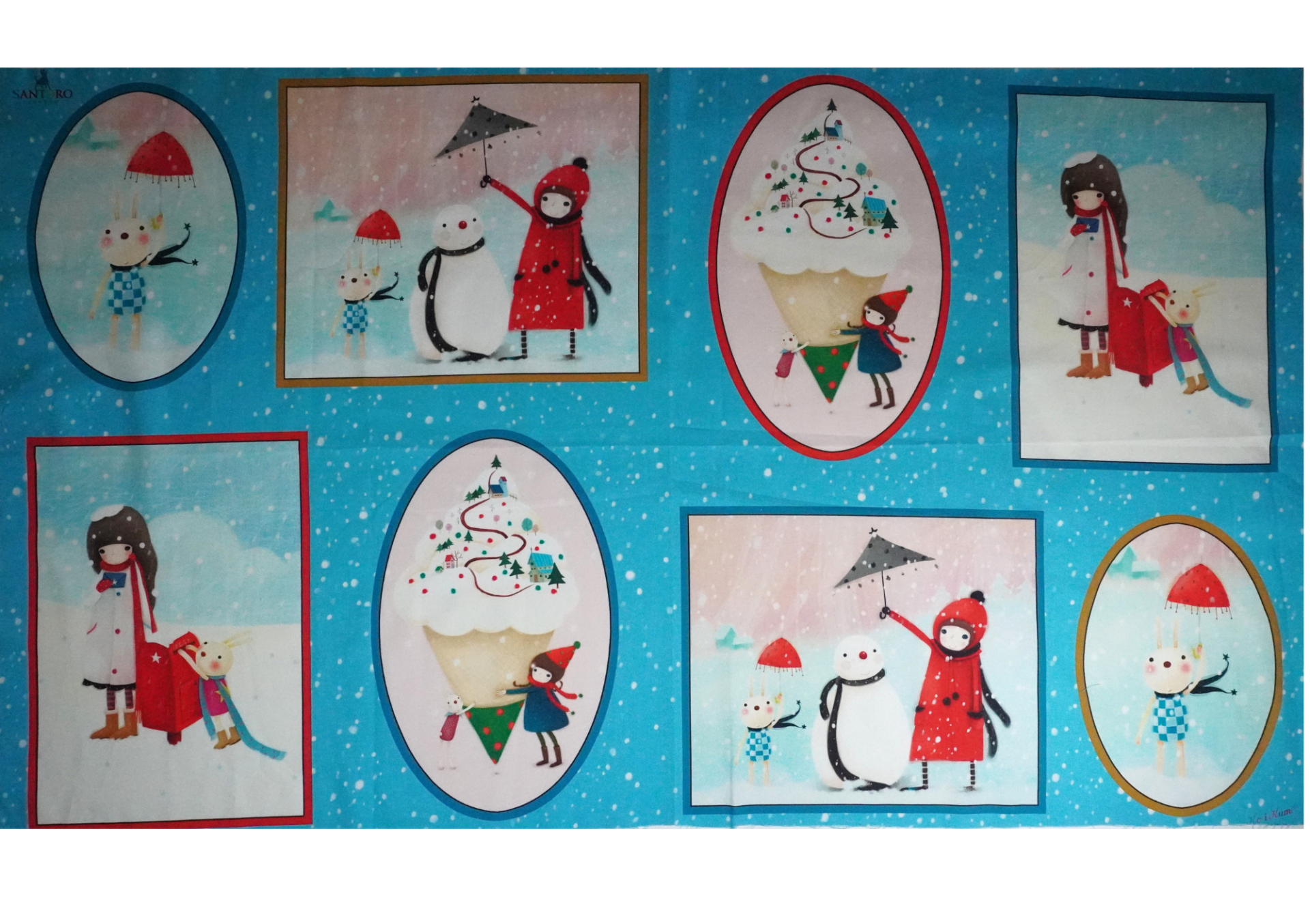 Painel em algodão estampado com ilustrações encantadoras de inverno, ideal para costura criativa e artesanato. As imagens incluem bonecos de neve, meninas e coelhinhos em cenários natalícios, com um fundo azul em ambiente de neve.